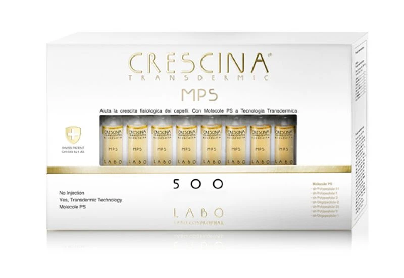 CRESCINA TRANSDERMIC RI-CRESCITA MPS (fiale ambra) è un trattamento ad uso topico di impiego cosmetico per la crescita fisiologica dei capelli con Tecnologia Transdermica che favorisce la penetrazione degli attivi – coadiuvati da 3 enhancer – sia attraverso gli osti follicolari che attraverso tutta la superficie del cuoio capelluto. La presenza di 7 Molecole PS (sh-Polypeptide-11, sh-Polypeptide-1, sh-Polypeptide-3, sh-Oligopeptide-2, sh-Polypeptide-31, sh-Polypeptide-9, sh-Oligopeptide-1) identiche alle molecole peptidiche endogene presenti naturalmente nel sistema pilifero, stimola profondamente la crescita del capello. Ulteriori attivi presenti: complesso Ri-Crescita, complesso HFSC, 3 enhancer. Per cuoio capelluto diradato.